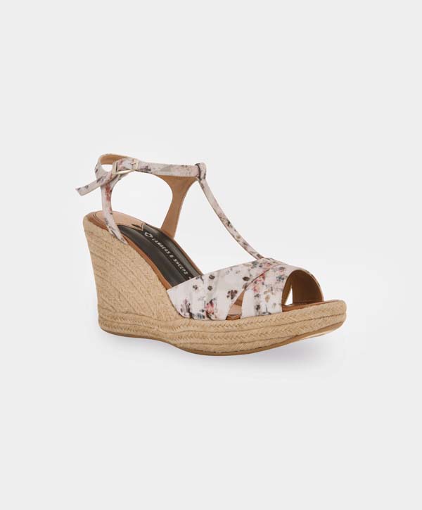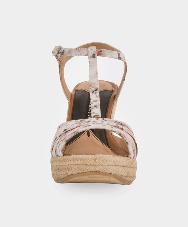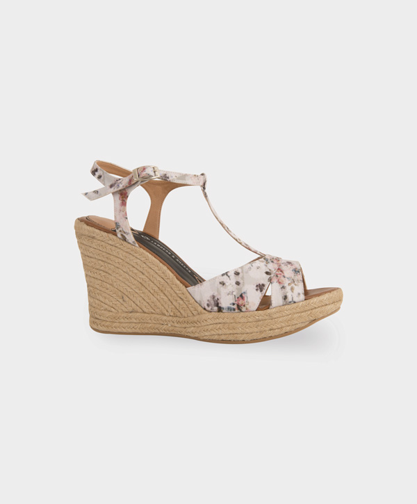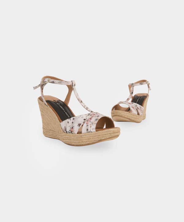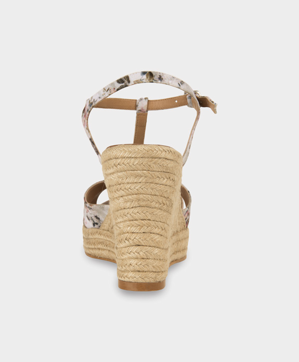 Alpargata en textil floreado en plataforma de yute natural.
