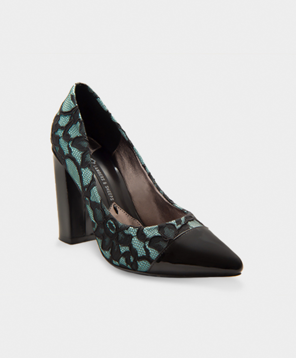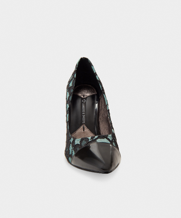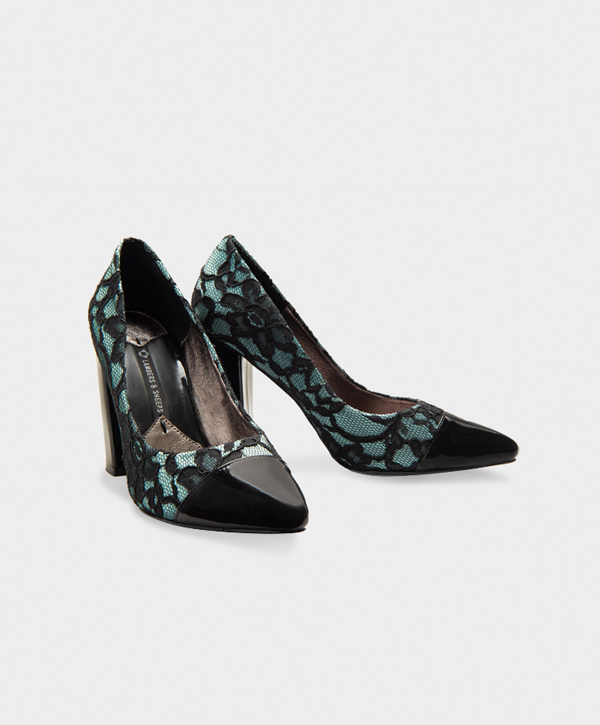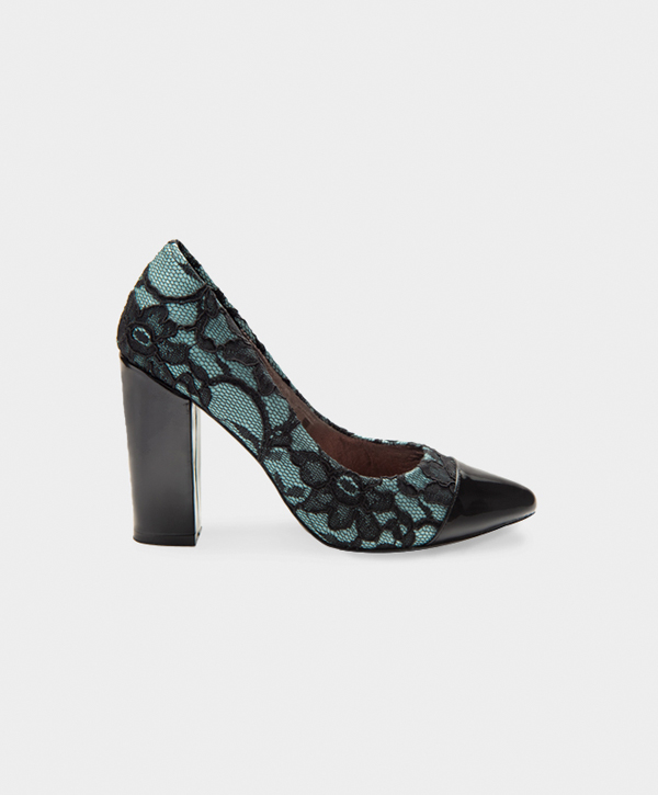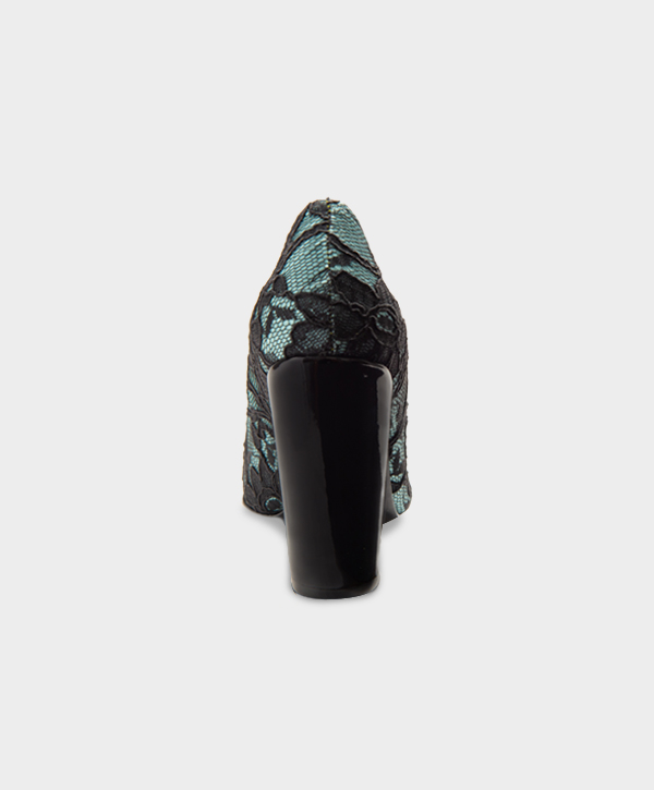 ZAPATILLA PUNTAL EN ENCAJE ESPAÑOL CON ADORNOS EN CHAROL DE CABRA. ALTURA 10 CM