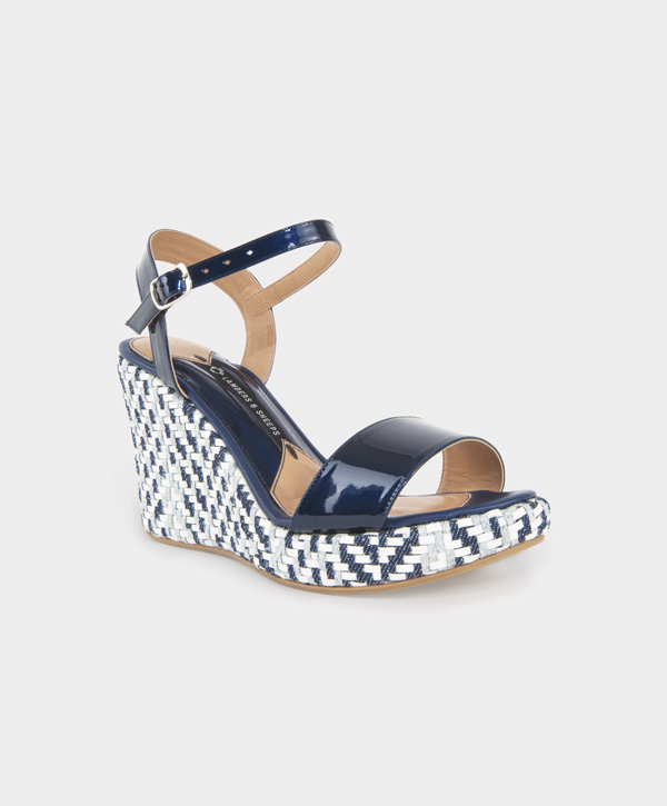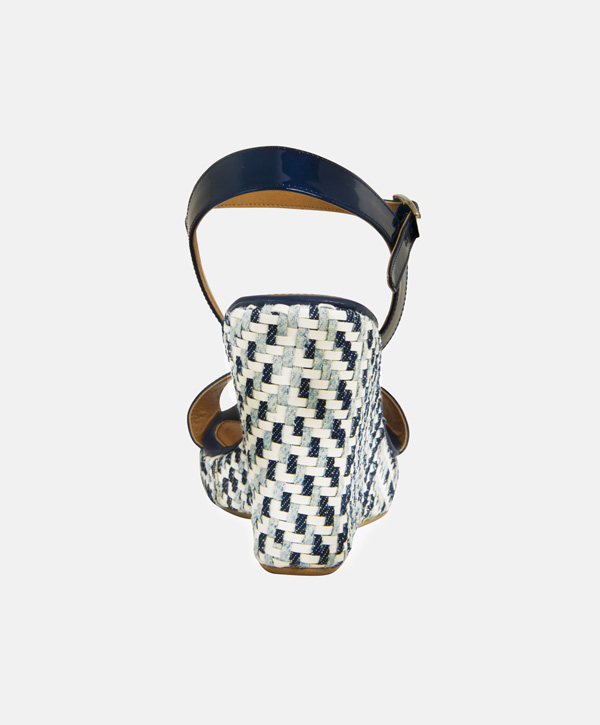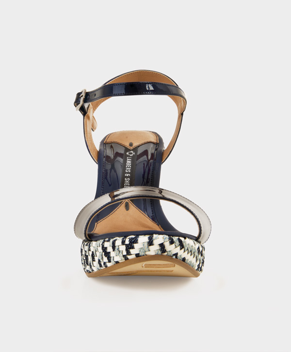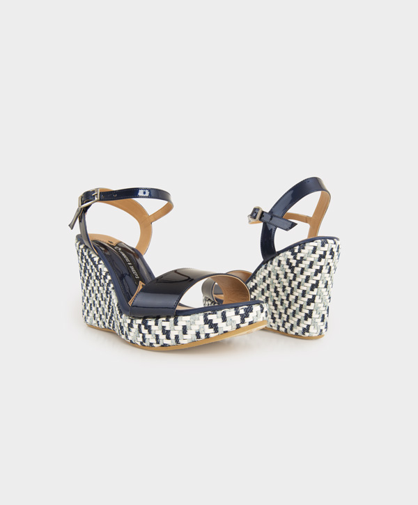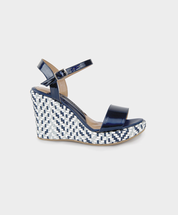 WEDGE EN CHAROL METALIZADO FORRADO EN TEXTIL CON NAPA Y MEZCLILLA. ALTURA 9.5 CM