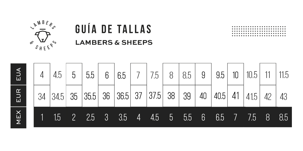 | Talla | 1 MX / 34 UE, 2 MX / 35 UE, 2.5 MX / 35.5 UE, 3 MX / 36 UE, 3.5 MX / 36.5 UE, 4 MX / 37 UE, 4.5 MX / 37.5 UE, 5 MX / 38 UE, 5.5 MX / 39 UE, 6 MX / 40 UE, 6.5 MX / 40.5 UE, 7 MX / 41 UE, 7.5 MX / 41.5 UE, 8 MX / 42 UE |