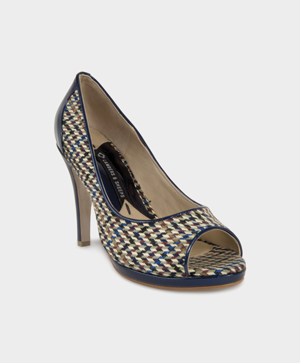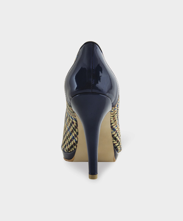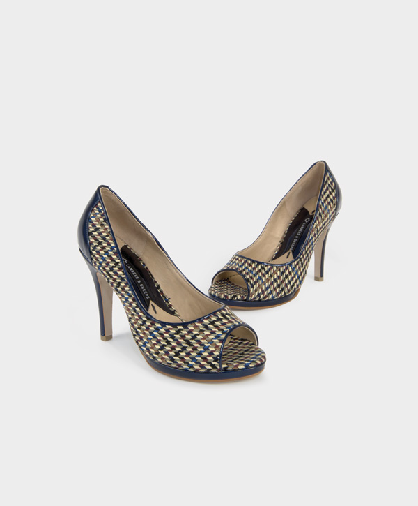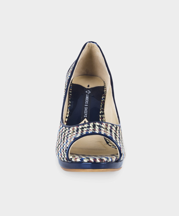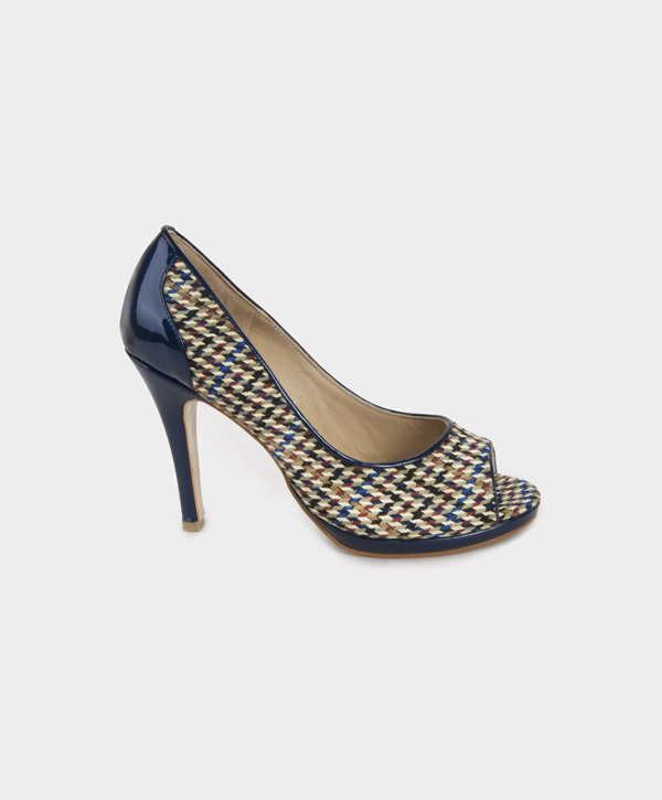 Peep toe de plataforma en pata de gallo español con adornos en charol de piel metalizado.