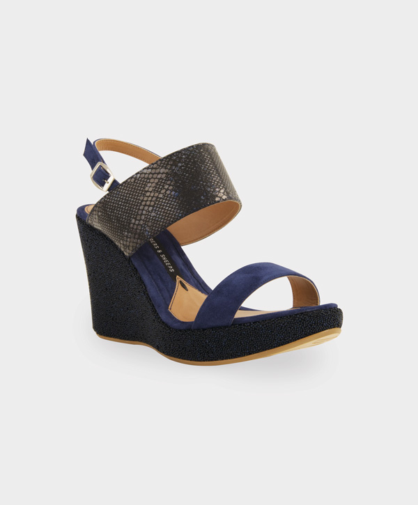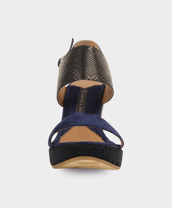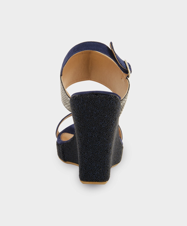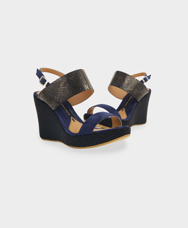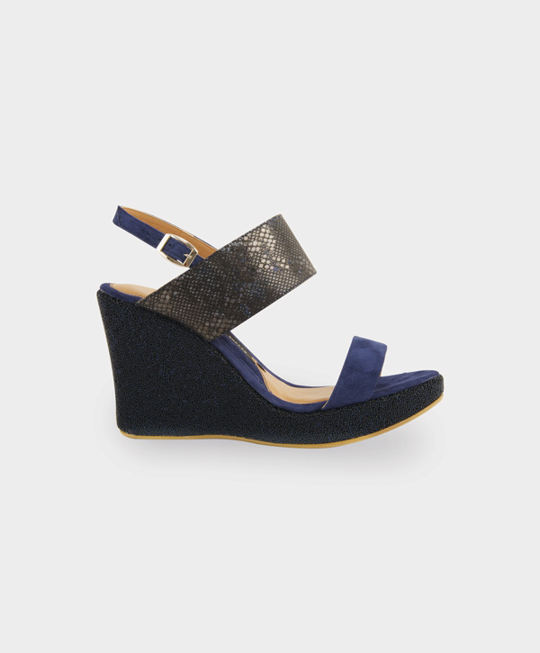 Sandalia de doble tira en ante de cabra con aplicaciones en piel grabada italiana.